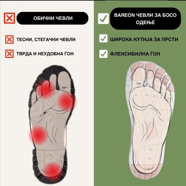 Со BAREON barefoot обувки, вие избирате удобност, здрави стапала и природно искуство на одење. Овие уникатни обувки ви го даваат чувството на одење боси додека обезбедуваат заштита и поддршка.